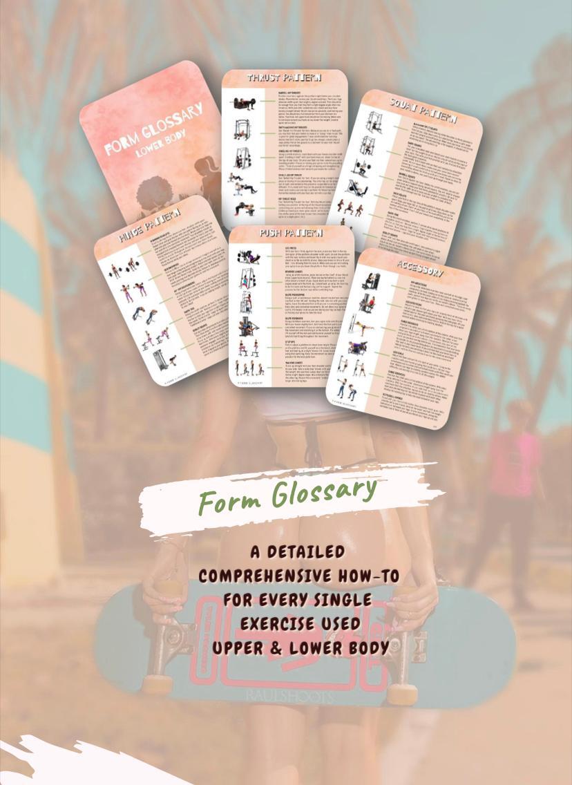 8 week gym based program, glute focused, back shoulder & arm training, fat shredding, nutritional guide, shake ideas for bulking & cutting, form glossary, progressive overload tracksheets, science based topics.